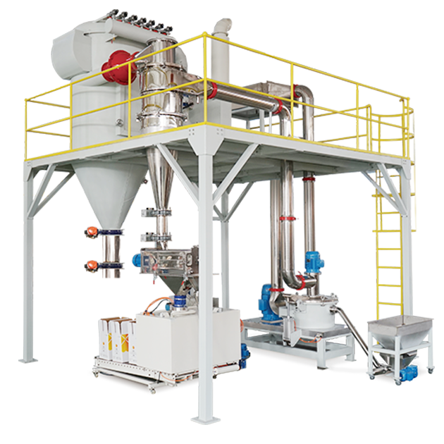 ACM系列微粉粉碎系統由空氣分級磨、旋風分離器、旋轉篩或者振動篩、超細粉集塵箱和高壓風機構成。具有高速破碎、空氣分級、旋風分離、篩分和超細粉收集等功能。通過調整運行參數可以獲得理想的粒徑分布。ACM系列微粉粉碎系統也可以用于顏料、鈣粉、碳粉、藥品及食品的粉碎。