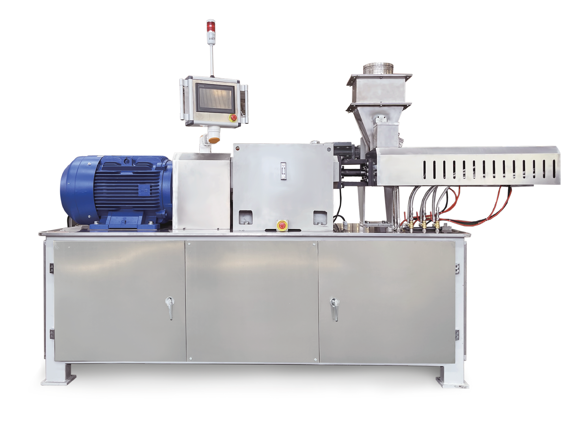 該系列擠出機(jī)為雙螺桿同向旋轉(zhuǎn)結(jié)構(gòu)。在安裝于雙螺桿上的螺旋塊和混煉塊相互精密嚙合作用下,將多組分原料充分熱融,達(dá)到好的分散及混煉效果。